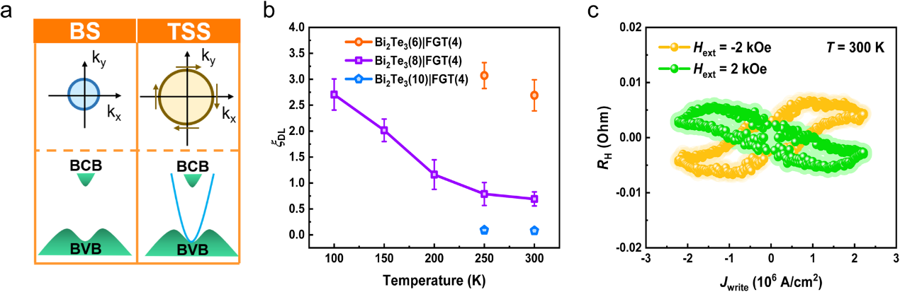 进一步地,基于以上具有室温磁性的全范德华异质结构,研究团队成功实现了室温下电流驱动的SOT翻转,并通过二次谐波测试得到室温下SOT效率值高达0.7,且随着拓扑绝缘体Bi2Te3厚度的减小,进一步提高至2.69。通过温度依赖性实验揭示了该异质结构高的自旋电荷转换效率主要归因于全范德华结构界面高的自旋透过率及非平庸拓扑态。在Bi2Te3/Fe3GeTe2异质结构中实现室温SOT翻转为未来实现室温全二维范德华自旋电子器件奠定了重要基础。
