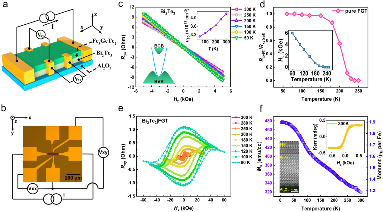 图 1 Bi2Te3、 Fe3GeTe2和异质结构Bi2Te3/Fe3GeTe2的磁学特性和电学特性