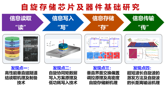 存储芯片是电子信息产业的基石。然而我国在该领域严重依赖进口,部分产品遭受禁运。基于电子自旋的磁存储芯片具有非易失、高速读写、低功耗和抗辐照等优势,是“后摩尔时代”集成电路领域的关键技术。然而,当前自旋存储芯片和器件面临数据读取裕度不足、写入功耗偏高、存储可靠性偏低和传输效率低下等基础科学问题。在核高基国家科技重大专项、北京市科技计划等项目的连续支持下,项目团队深入开展自旋存储芯片及器件基础研究,取得以下重要科学发现,为研制国产高性能存储芯片提供支撑。