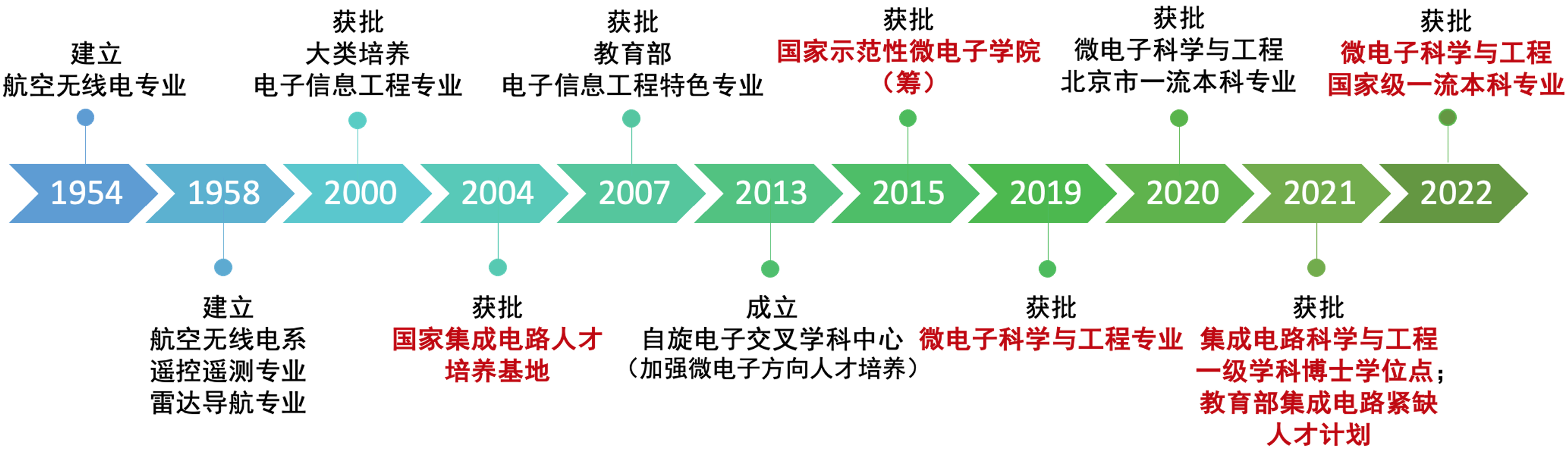 本专业的历史可追溯至北航航空无线电专业,先后获批国家示范性微电子公司(筹)、北京市一流本科专业、教育部集成电路紧缺人才计划、集成电路科学与工程一级学科博士学位点、国家级一流本科专业,公司还获批建设科技部国家国际科技合作基地、教育部高等公司学科创新引智基地、工信部重点实验室等创新平台。