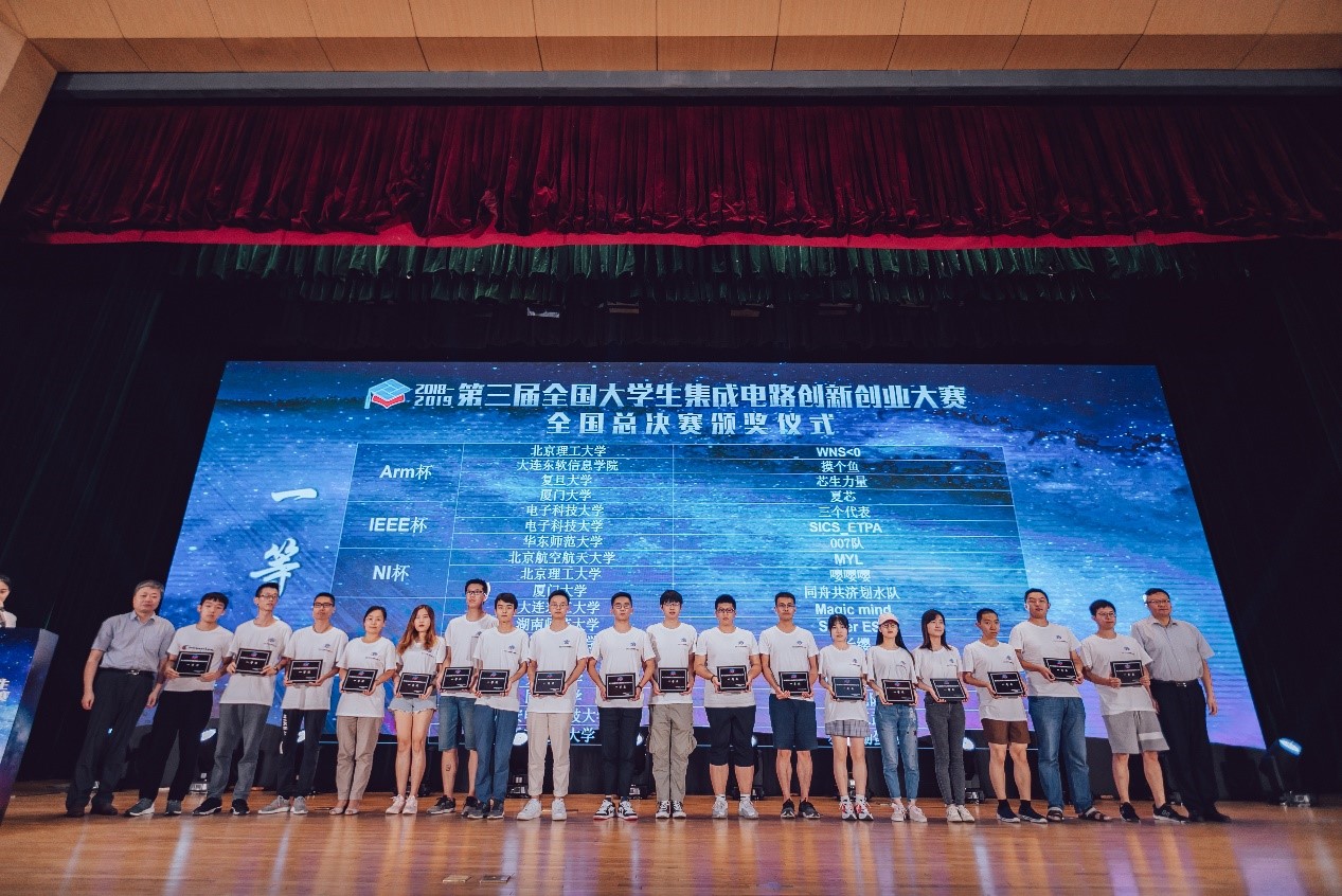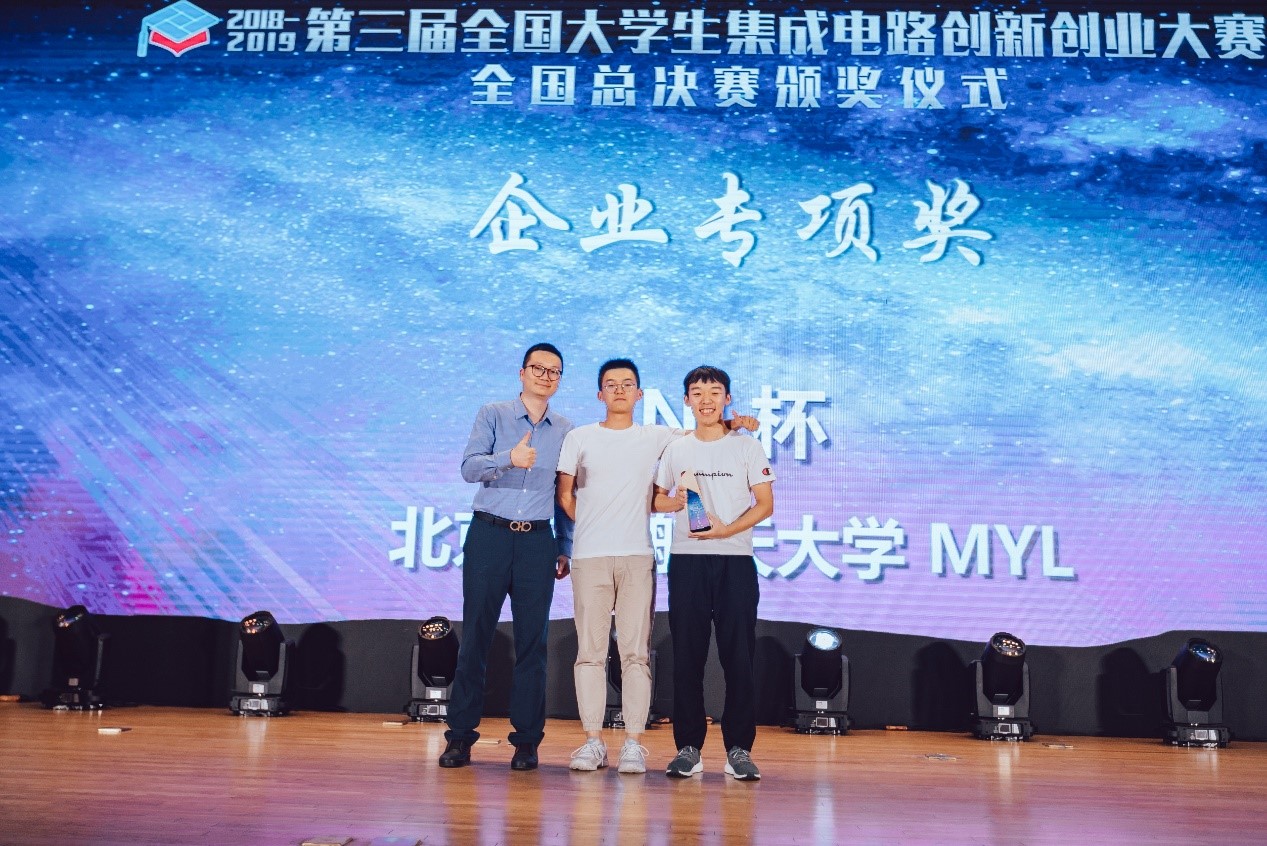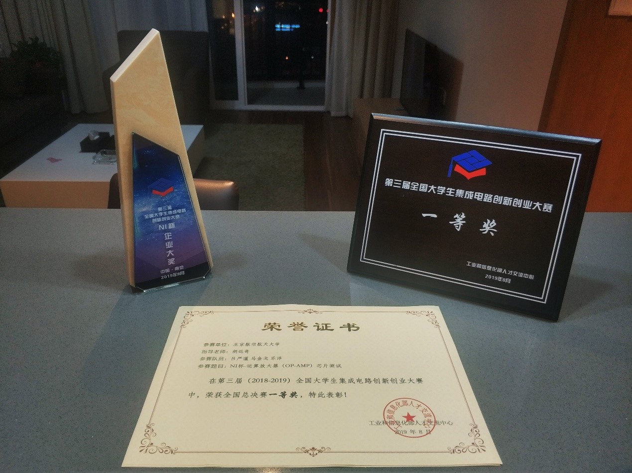 今年公司胡远奇教授指导吕严谨,马金戈,乐洋三名本科生组成 MYL 队,参加集创赛 NI 杯的比赛,此题要求基于给定平台完成运算放大器参数的自动化测试。大家自 3 月起完成组队报名参赛, 6 月提交设计文档通过初赛进入分区决赛, 7 月参加华北赛区决赛晋级全国总决赛,最终在全国数百只队伍中脱颖而出,获得全国一等奖——“企业专项奖”。