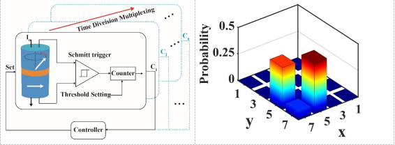 为了解决上述问题,曾琅副教授团队基于在自旋纳米振荡器领域的深厚研究基础[8-10],首先提出了一种基于自旋纳米振荡器的真随机数发生器,采用热噪声对振荡频率的扰动作为熵源,实现了高速、低功耗、概率可调的随机数输出。之后,将随机数发生器作为概率比特,并提出了一种新颖的递推耦合规则,成功完成了逻辑门计算。最后,采用了时分复用的思想,使用单个自旋纳米振荡器概率比特完成了质因数分解的计算,准确率高达87%。