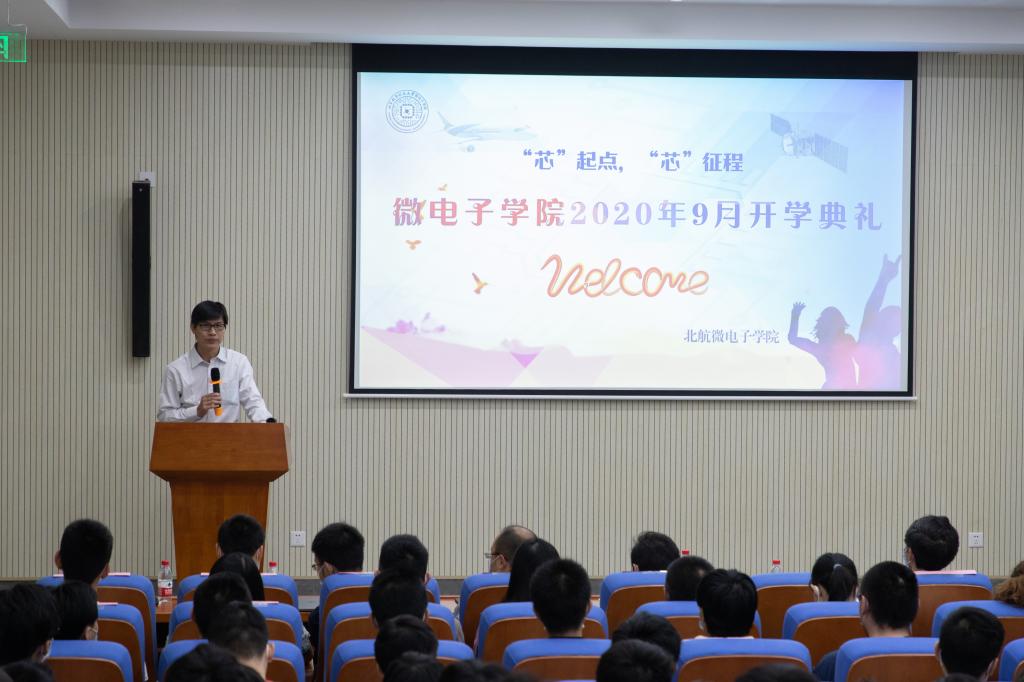 经理赵巍胜教授首先进行致辞和介绍公司发展情况。赵经理对新加入微电子公司的同学们表示欢迎,他从微电子产业发展背景和现状、公司建设和发展情况、员工培养体系及培养目标等方面对公司进行了介绍,对全体同学寄予了深切的希望,鼓励同学们弘扬空天报国的北航精神,胸怀寰宇,致真唯实,勇于承担历史的责任,将自己的奋斗融入时代变革的大潮中。