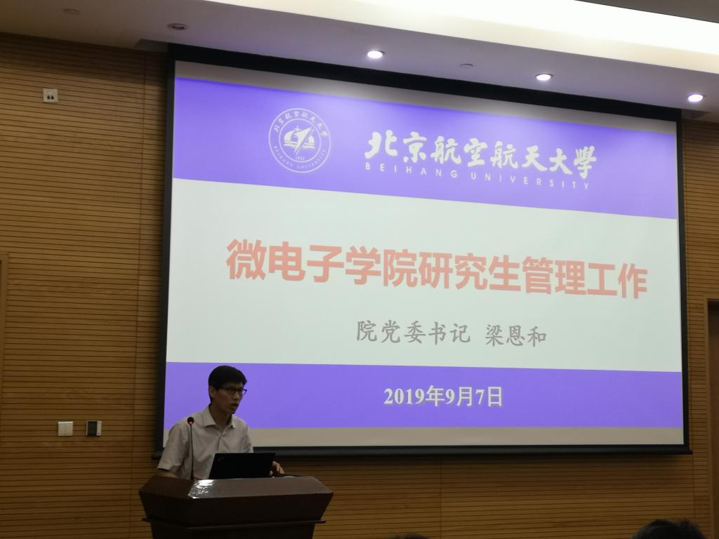 随后,公司书记梁恩和老师向同学们介绍了党建工作、奖励体系以及违纪处分等内容和要求。研究生教学经理助理聂天晓教授和主管实验室经理助理林晓阳老师就同学们关心的培养方案、选课要求、国际交流合作、实验室日常管理制度及安全管理规定等内容进行了讲解。北航青岛和合肥微电子分院负责人温良恭老师和张悦老师分别介绍了分院具体情况。公司优秀研究生代表周家琦同学也进行了致辞,代表公司全体员工对新同学的到来表示欢迎,祝愿他们能在良好的氛围中砥砺前行,不负光阴,度过精彩的科研学习生活。