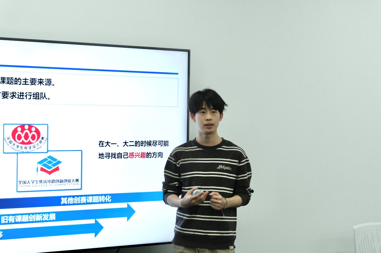 紧接着,2021级本科生陈欣雄同学带来了科创竞赛经验分享。陈欣雄曾获首批北京市自然科学基金“启研”计划资助,冯如杯制作组二等奖、“互联网+”北京市二等奖、北航电子创新大赛一等奖等奖项,项目成果已发表2篇SCI论文。他围绕参与科技竞赛的全过程,从竞赛的选题、团队组建、项目实施到最终的成果展示,详细讲述了每一个环节的要点和心得。陈欣雄认为,科技竞赛不仅是对专业知识的一次全面检验,更是团队协作和创新思维的锻炼。他鼓励学弟学妹们勇于挑战自我,积极参赛,在各类科技竞赛中全方位提升自己的综合能力。