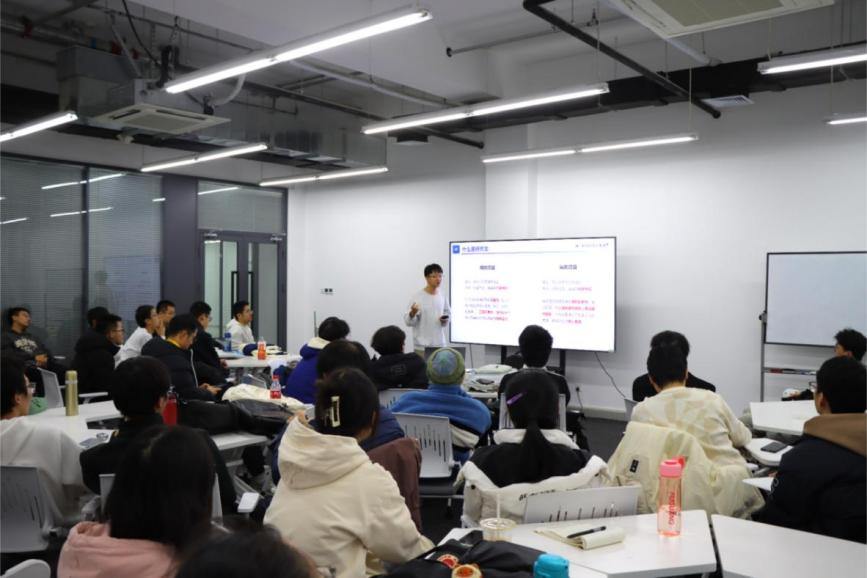 1月10日晚上,两届冯如杯冠军得主、24级博士研究生寇竞带来科创竞赛经验分享。寇竞在分享中,将一个完整的科创项目划分为:故事、技术、商业和展示四个关键维度,并细化七个步骤,深入浅出地介绍了如何打造一个成熟的科创项目。寇竞以冯如杯为例,强调了理论创新、技术创新、方法创新、应用创新在竞赛中的核心地位,并向同学们传授了PPT制作、汇报展示等实用技巧,为同学们正在准备的智创赛开拓思路。