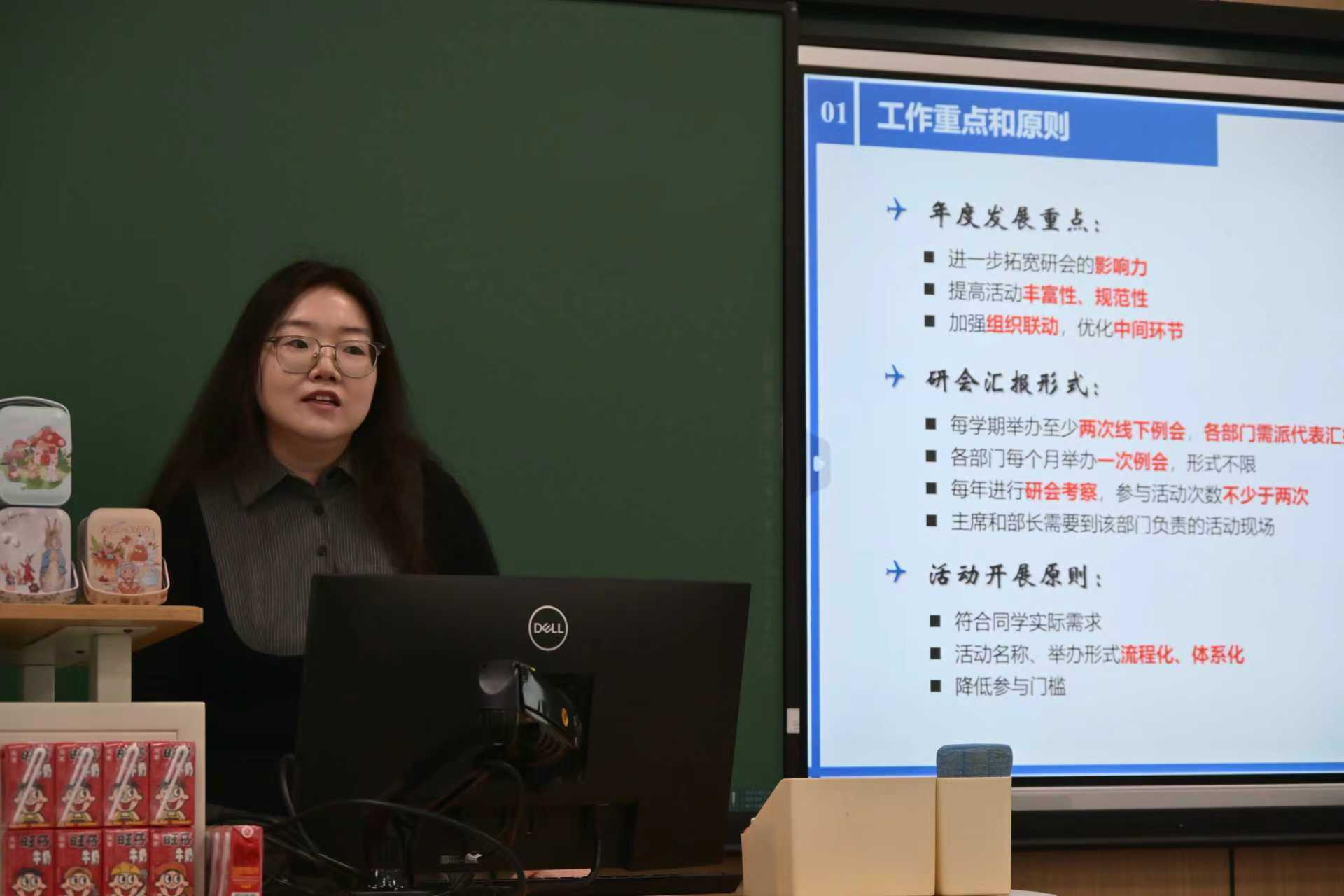 接着,会议进入研会年度工作计划梳理环节。第五届研会主席团成员张欣悦向全体成员介绍了研究生会未来一学年的工作规划。她提出,研会应进一步拓展活动覆盖范围与组织影响力,不断提升内容质量与组织水平,同时优化流程设计、降低参与门槛,以提升同学们的整体参与体验。在机制建设方面,她强调需保持合理的例会频率,持续激发成员积极性,并加强资料归档与资源共享,逐步构建标准化的工作流程。