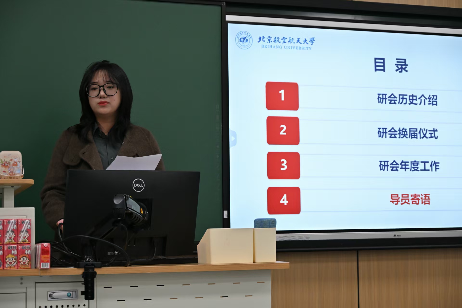 会议第二项是研会交接仪式。公司兼职辅导员彭尹萱代表公司对第四届研究生会过去一年的辛勤付出表示充分肯定,并为第四届研会主席团及部长团成员赠送了伴手礼。第四届研会主席团成员程科勋为新成员送上寄语,分享了他对科研、生活与研会工作之间平衡之道的体会,并鼓励大家珍惜研会这一宝贵平台,充分发挥主人翁意识,在服务同学的同时实现自我成长,共建有温度、有活力的研会集体。