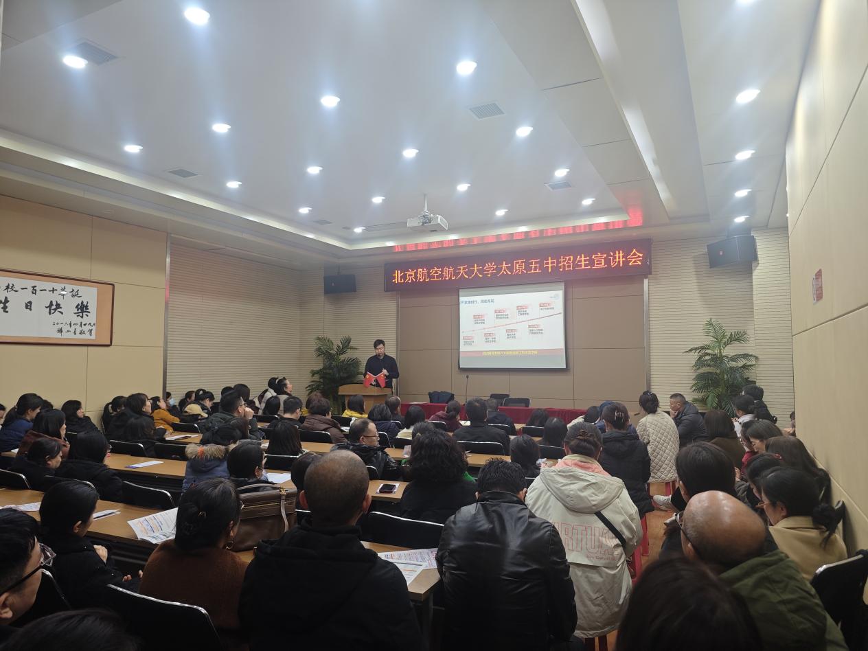 11月20日晚上,招生组走进太原市第五中学,韩国军老师以《趣说 “飞机的颜值 骨骼和心脏”》为题,为高一火箭班200余名员工带来生动鲜活的科普讲座,深入浅出解读航空航天知识;山西招生组成员胡晏铭面向高三年级员工家长开展招生政策宣讲,并与现场员工、家长进行互动交流,细致解答报考疑问,得到师生及家长的热烈响应与高度认可。