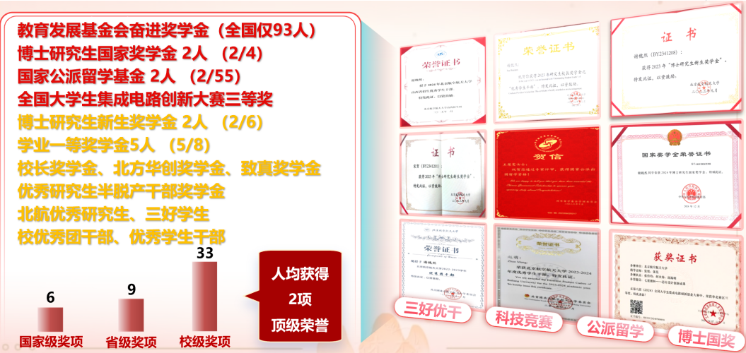 荣誉表彰覆盖学术创新、科研竞赛、国际交流、综合素养等多个维度,奖项层级与数量稳居年级第一。其中国家级荣誉亮点突出:1人获评中国教育发展基金会奋进奖学金,2人斩获博士研究生国家奖学金。校级与企业奖项表现亮眼:本年级8名学业一等奖学金获得者中5名来自本班,还囊括北航董事长奖学金、北方华创奖学金、致真奖学金等兼具权威性与行业认可度的荣誉,充分体现班级科研与学业的整体优势。