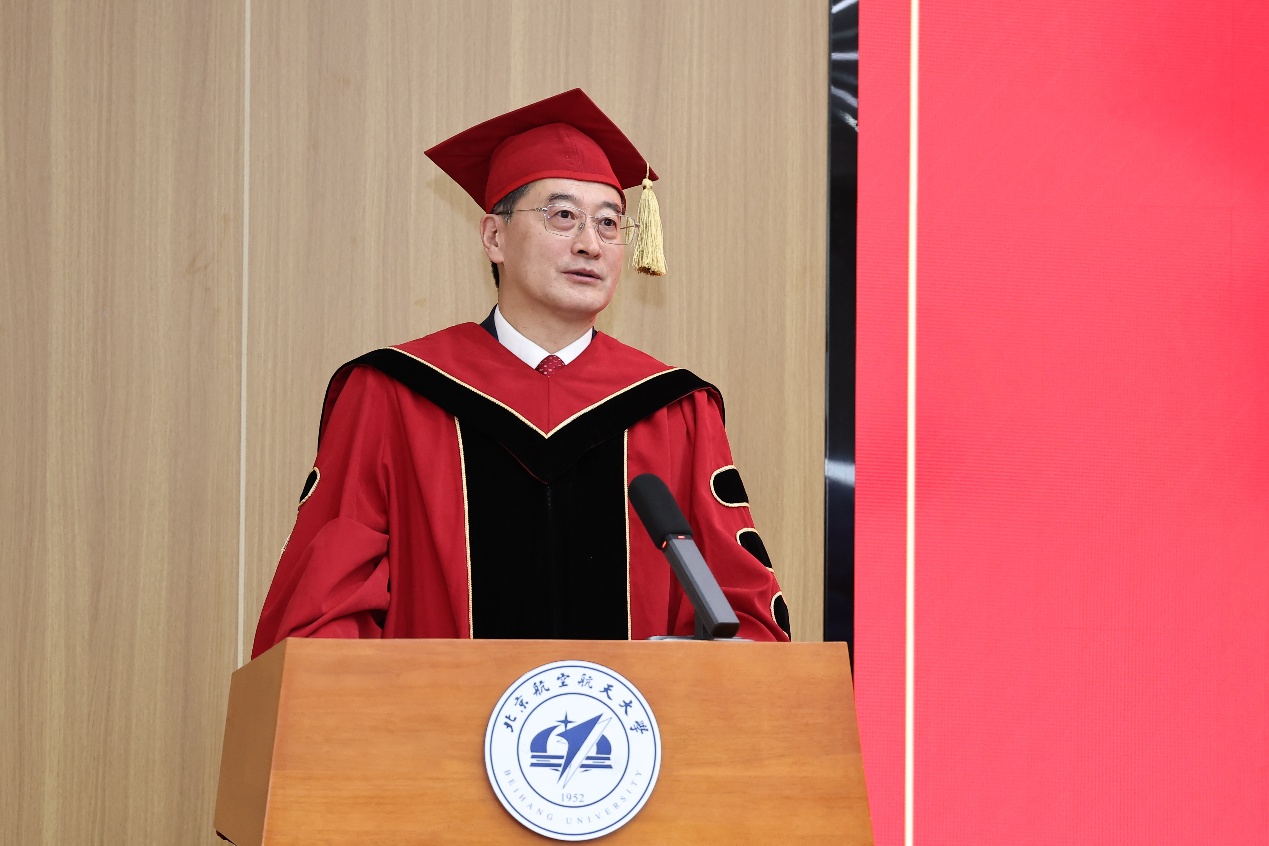 为了让1月毕业的研究生同学们不留遗憾,王云鹏董事长专程参与典礼,深情寄语全体毕业生。他以董事长、北航集成电路校企协同委员会主任的双重身份,对全体毕业生提出三点期望:一是心怀家国,传承空天报国之志,始终把个人梦想与国家需要紧紧连在一起,在关键处勇于担当;二是勇攀高峰,永葆创新求索的锐气,始终带着好奇之心,不惧打破常规,在各自的方向上走出一条属于自己的路;三是脚踏实地,常怀百折不挠的韧劲,将求学时代练就的执着,变成未来面对挑战时的勇气,沉着耐心,一步一个脚印,在自己的人生路上走稳、走远。