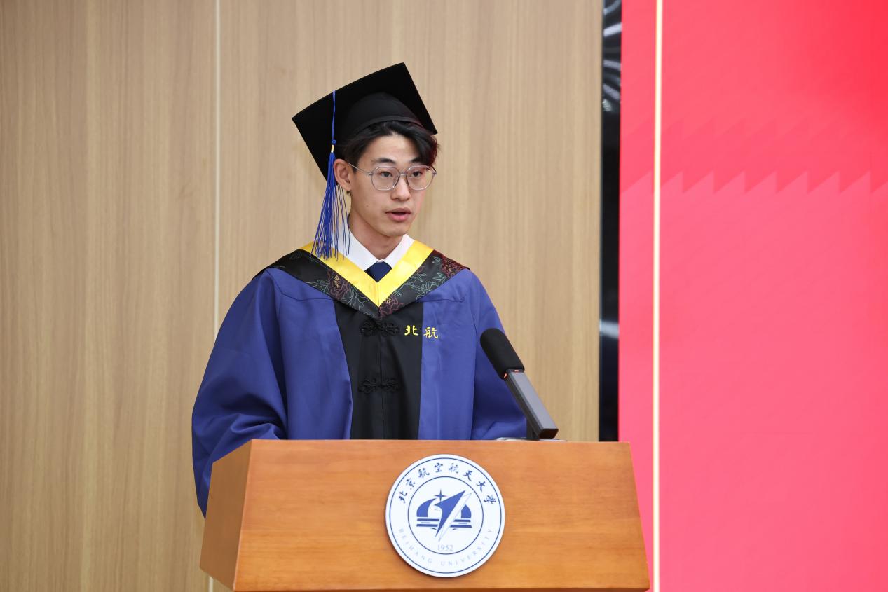 毕业生代表、2023级硕士研究生刘继隆代表全体毕业生向母校、老师、家人表达了感恩之情。他回顾自己在公司求学的本硕七年时光,不仅是公司发展的见证者,更是这份辉煌征程的亲历者、参与者,与公司携手同行、双向成长。这段经历,让他从迷茫忐忑成长为独立敢为的青年,更沉淀下“矢志不渝,敢为人先,致真唯实,芯片报国”的北航“芯”精神,成为未来前行的宝贵财富。