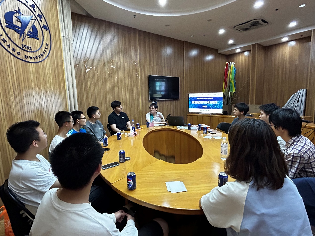 郑翔宇以"先进光刻机技术及原理"为主题,从“什么是光刻机”、“光刻工艺步骤”、“光刻机发展史”、“光刻机性能指标”以及“光刻机核心部件”五个部分,向同学们介绍集成电路制造产业技术体系。