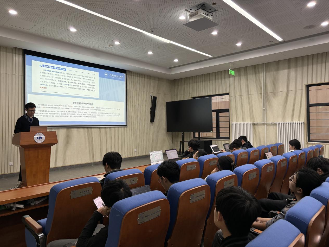 冯如杯一等奖获奖团队代表李文硕向同学们分享了自己的比赛经验。李文硕结合所在团队的获奖项目,从选题的思路来源、项目的创新方法、答辩的展示技巧等方面,全面立体地分享了竞赛经验,令同学们对科创竞赛有了更深入的理解。