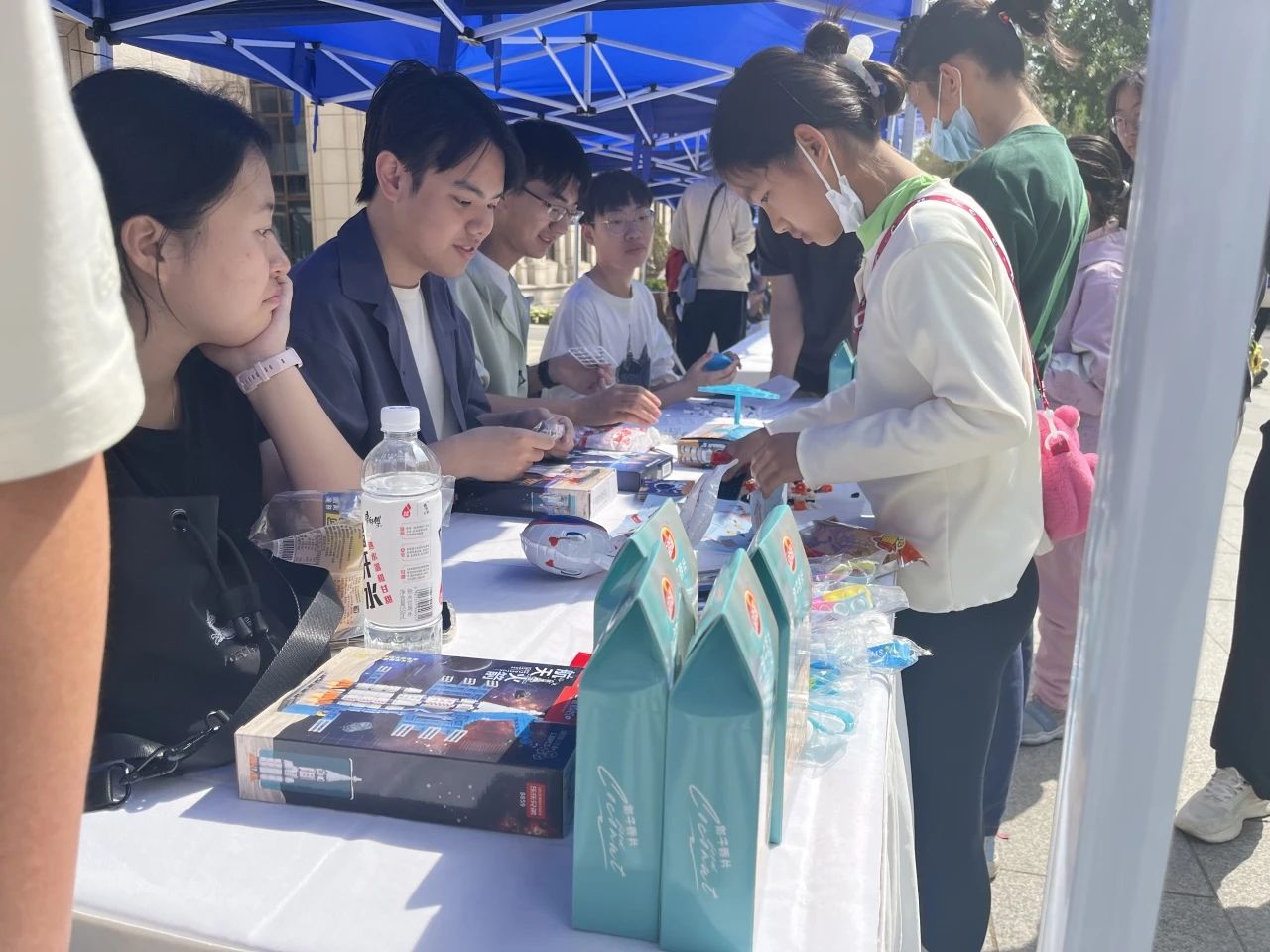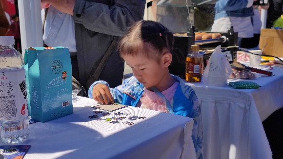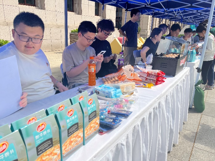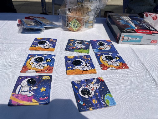 展位共设置互动游戏、拼图积木、知识问答和礼品区四个区域:互动游戏区域准备了“平衡太空人”桌面益智小游戏,供参与者游玩;拼图积木区域准备了太空题材的拼图和宇宙飞船主题的拼装积木,参与者通过在时限内完成拼图还原或积木拼装来赢取礼品;知识问答区域准备了若干航天领域相关的常识题目,参与者随机抽取五道,根据正确答题数量获得对应级别的礼品;礼品区的志愿者架起了烤肠机,制作烤肠作为活动奖品,美味的烤肠成为了公司展位的最火爆的风景线。除了烤肠,展位还准备了来自海南文昌发射基地的特色零食、航天主题的文创产品作为活动礼品,参与者络绎不绝。