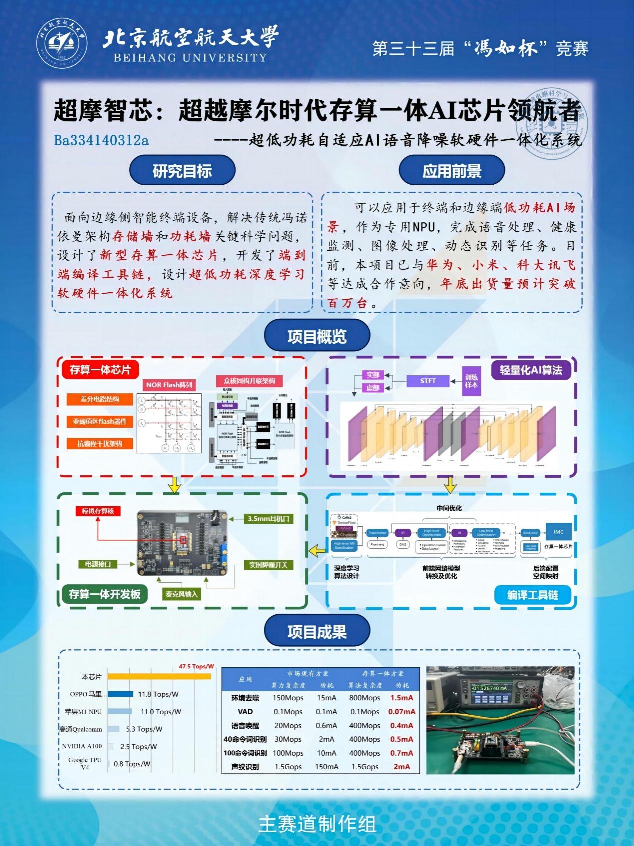 5月27日,冯如杯主赛道制作组一等奖答辩评审在晨兴音乐厅举行,公司两支参赛队伍充分展示了他们的研究能力和创造力。在现场答辩过程中,他们详细介绍了自己的项目设计思路、实验过程和取得的成果,通过多种形式充分展示了他们的项目内容。评审团对每个项目都进行了深入讨论,并提出了宝贵的建议和意见,对参赛队伍的表现给予了高度评价。经过激烈角逐和评审,最终评选出了本次答辩评审的获奖队伍——“超摩智芯——超越摩尔时代存算⼀体AI芯片领航者”,他们在集成电路设计、性能优化、功耗控制等方面取得了卓越的成果,展现了在集成电路领域的创新发展潜力。
