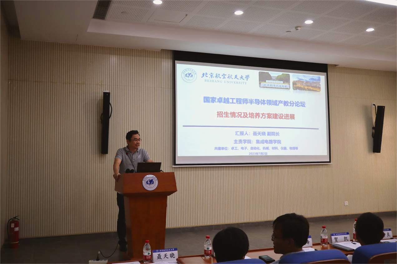 接着,聂天晓副经理进行汇报,分别对卓工专项背景、现有招生方案、现有招生情况和培养方案制定以及课程体系建设进行了详细介绍。半导体领域是构建信息社会发展与技术进步的基础与核心,但当前存在人才培养与产业严重脱节的问题,而卓越工程师为人才培养开拓了新的模式。北航作为卓越工程师首批改革试点单位,为解决校企脱节问题,推动企业与高校协同,共同制定卓越工程师的培养方案,培养半导体领域卓越工程师,为人才培养提供良好发展平台,助力我国芯片技术自立自强。