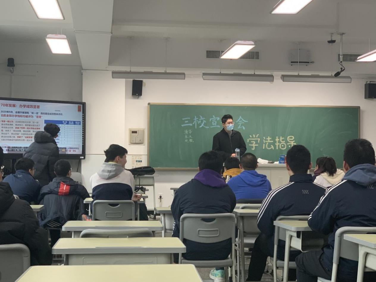 在寒假的返校宣讲中,我回到久别的高中母校去宣传我将度过四年美好岁月的美丽北航。在三次宣讲中,我把自己在BUAA的生活向学弟学妹们分享,也给他们介绍了一些我高三的学习方法,鼓励他们昂扬斗志为高考继续奋斗。宣讲氛围很好,我们互相交流了一些想法,不少学弟学妹在了解北航的历史后对北航产生了向往。我非常感谢能有这次机会回到高中母校、回顾高中生活,也希望为学弟学妹们照亮前路。