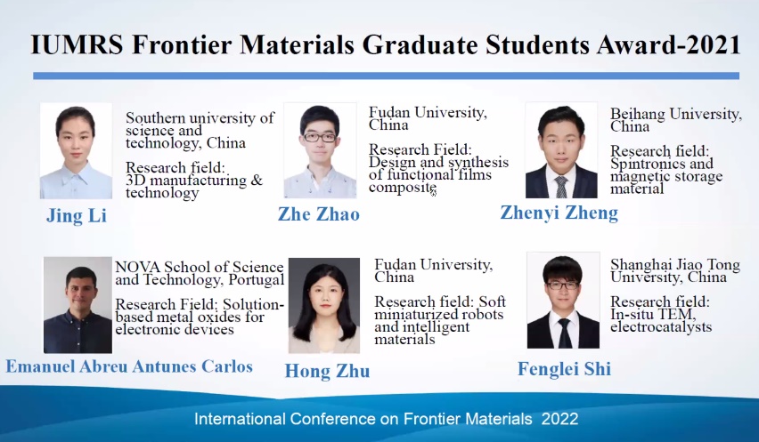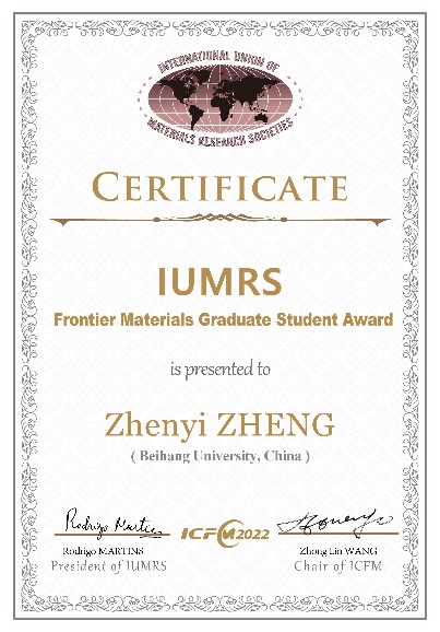 2022年5月28日,国际材料研究学会联盟(International Union of Materials Research Societies,IUMRS) 举办的2022国际前沿材料大会(International Conference on Frontier Materials)在线上召开。IUMRS公布2022年前沿材料研究生奖(Frontier Materials Graduate Student Award) 获奖名单,yl23455永利博士生郑臻益获奖。