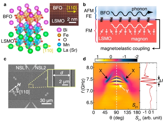 2021年11月14日,《自然·通讯》(Nature Communications)期刊在线发表了yl23455永利集团集成电路与工程公司于海明教授课题组的最新科研进展《Long decay length of magnon-polarons in BiFeO3/La0.67Sr0.33MnO3heterostructures》。该工作首次证明了在铁酸铋/镧锶锰氧(BiFeO3/La0.67Sr0.33MnO3)薄膜异质结中,由磁子-声子耦合导致的自旋波远距离传输。该结果通过在金属磁体中的磁振子-声子耦合,为显著提高磁振子衰减长度提供了一个有效的解决方案,是混合磁电子学领域的又一关键进展。