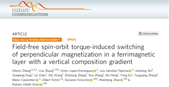 Z.Zheng, et al. Field-free spin-orbit torque-induced switching of perpendicular magnetization in a ferrimagnetic layer with a vertical composition gradient.Nat.Commun.12, 4555 (2021).