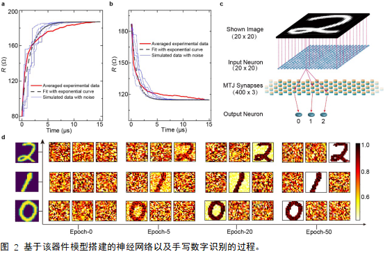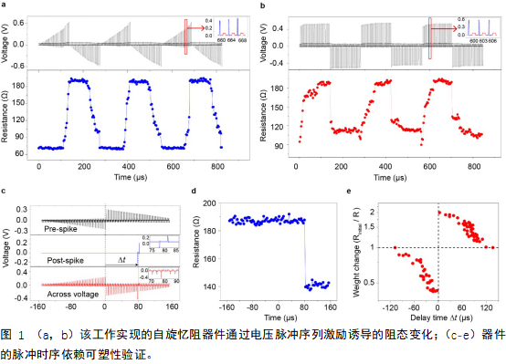 该论文工作对这种新型器件的性质进行了全面的实验表征,验证了该器件阻态的脉冲时序依赖可塑性(简称STDP,是脉冲神经网络的基础),证明了该器件构成的系统能够高效率、低功耗地实现手写数字识别等功能。