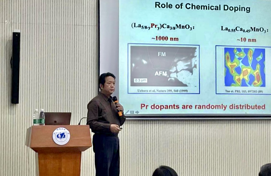 参观环节结束后,由雷娜老师主持,沈健教授为与会师生带来了题为《氧化物中复杂磁畴结构的物理成因及器件应用》的精彩报告。沈老师从2006年起,开始深入研究复杂氧化物的磁畴物理机理;在理解其物理本质的基础上,实现了对宏观物性的调控以及在新型自旋电子器件中的应用,获得了多项原创性发现。凭借多年的研究,沈老师在氧化物复杂磁畴结构的形成原因上展现出了独到的理解,以原理-实验-应用的顺序深入浅出的介绍了复杂氧化物中的多畴并存现象,并在器件应用上打开了广泛的思路,为后续研究提供了方向。学术报告后,与会师生与沈老师展开了热烈的讨论,获得了沈老师的悉心解答,师生们用经久不息的掌声对沈老师带来的精彩报告表示衷心的感谢。