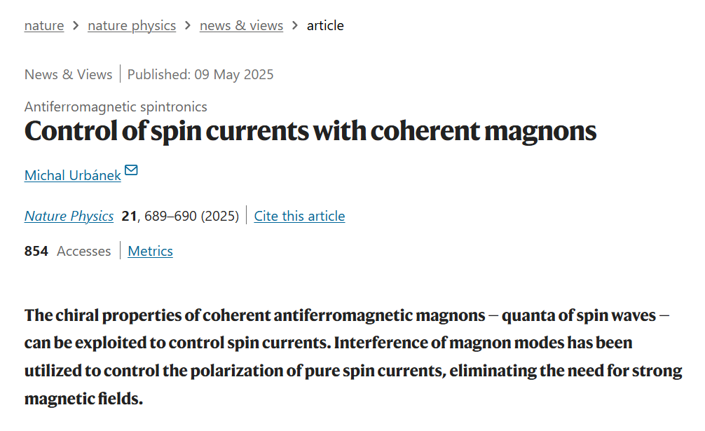 2. Urbánek, M. Control of spin currents with coherent magnons. Nat. Phys. 21, 689–690 (2025). https://doi.org/10.1038/s41567-025-02898-6
