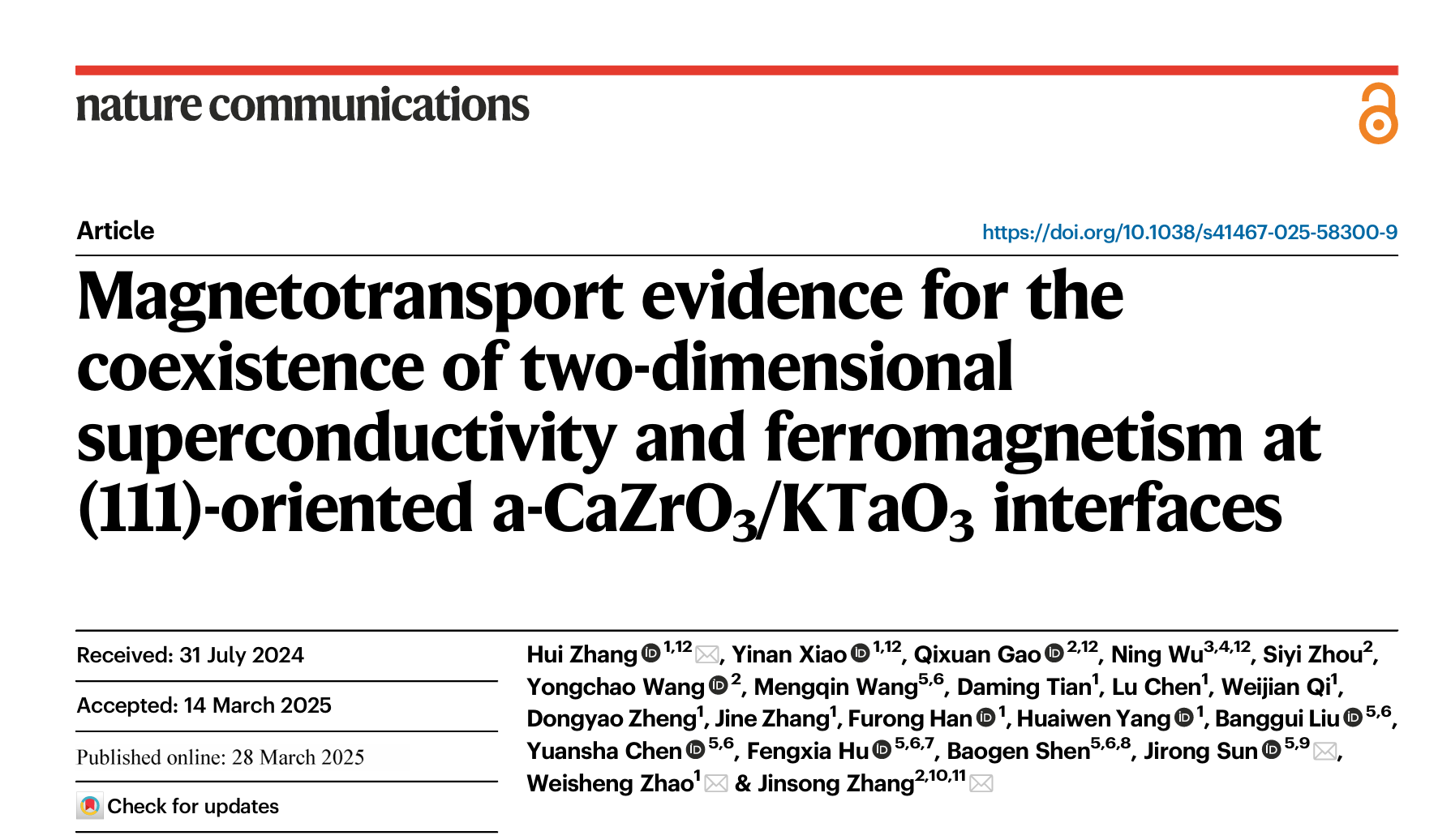 Zhang, H., Xiao, Y., Gao, Q. et al. Magnetotransport evidence for the coexistence of two-dimensional superconductivity and ferromagnetism at (111)-oriented a-CaZrO3/KTaO3 interfaces. Nat. Commun. 16, 3035 (2025).