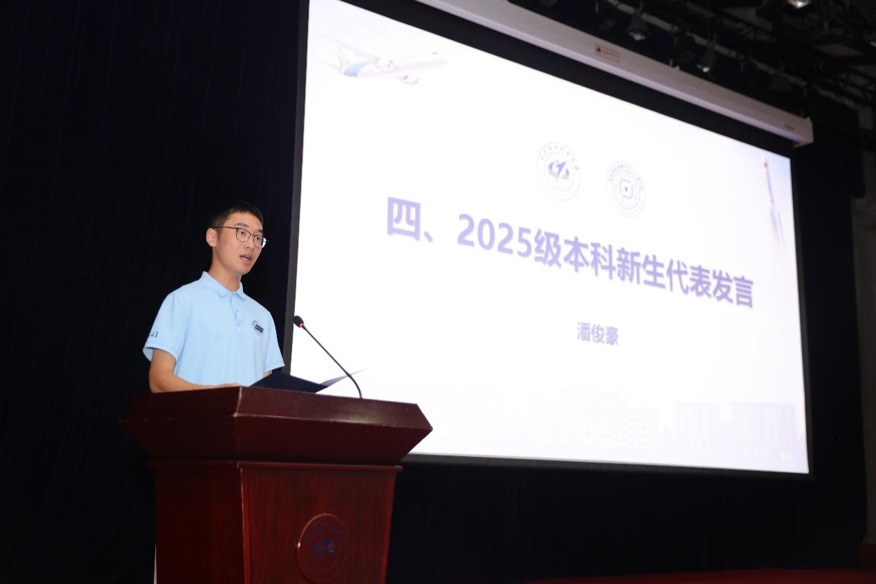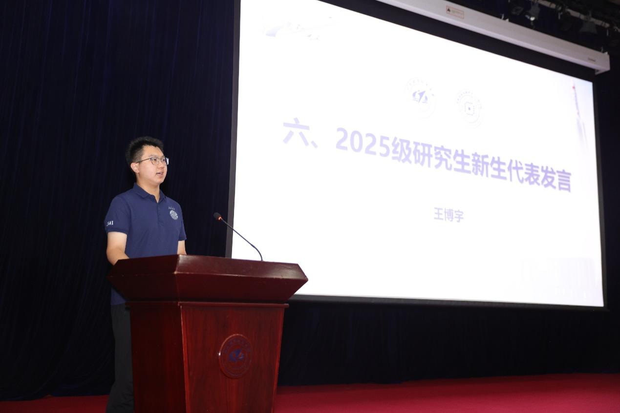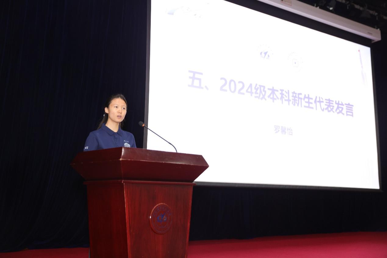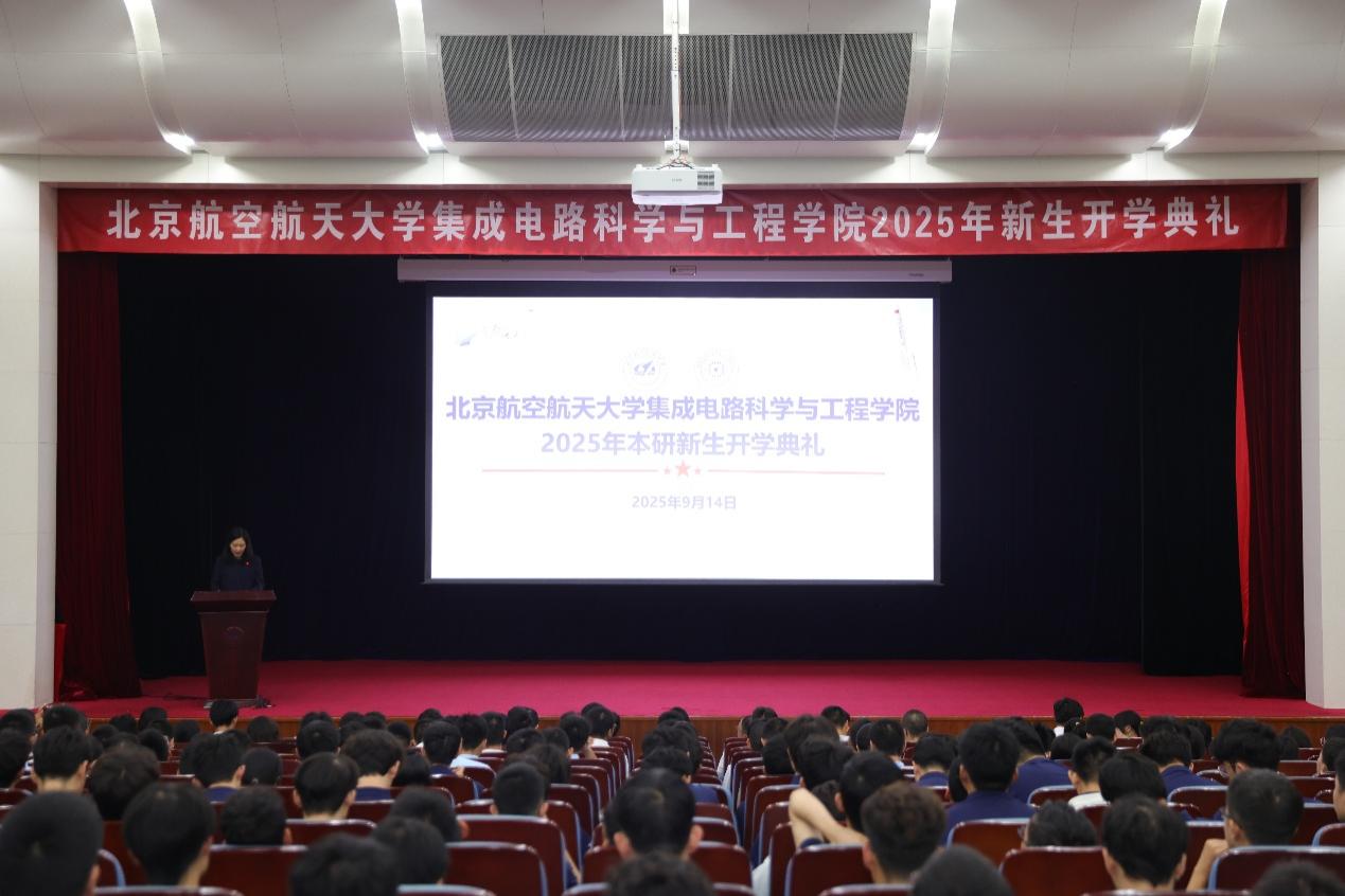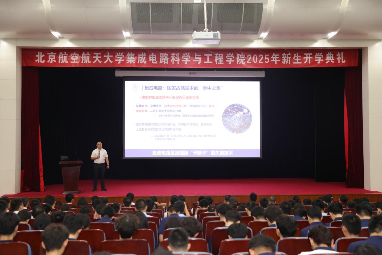 随后,教师代表贾小涛老师以“以‘芯’为剑,与国同行,敢为天下先”为题,向新生表达欢迎并提出期望:勤学善思、打牢根基;敢于探索、勇于创新;修身立德、学会担当;全面发展、拥抱青春,号召同学们勇立潮头,书写青春篇章。