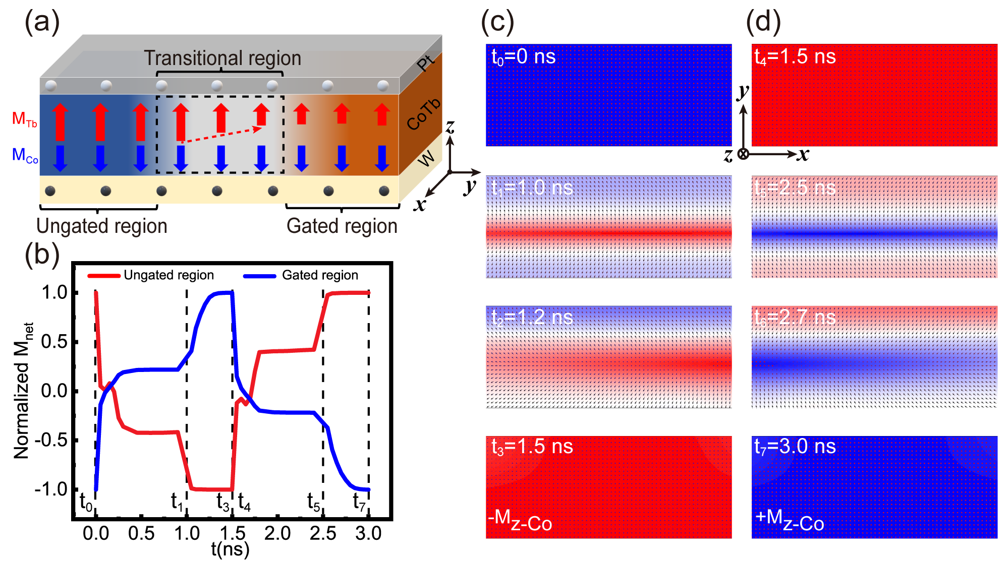 针对这一关键问题,团队围绕另一类磁性材料——亚铁磁合金材料展开研究。亚铁磁合金CoTb具有双亚晶格反铁磁耦合、杂散场低、磁结构丰富等特点。研究结果表明,利用固态氢离子栅控结构,通过电压驱动氢离子在亚铁磁薄膜中的非对称迁移,能够构建出一种非常规的新型磁型结构。具体而言,该磁性结构表现为相邻区域净磁化方向相反,但亚晶格磁矩方向相同,即具有“宏观上表现出不同磁畴,但微观上磁畴转化区域并不存在畴壁”的特点(见图1),突破了传统磁畴与畴壁相伴产生的常规认知。并且,通过电压控制氢离子迁移方向,能够动态、可逆地调控该新型磁性结构的存在与湮灭。
