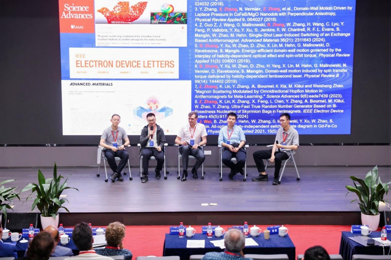 在为期三天的研讨会中,三十余位国际专家展示他们在自旋电子存储与计算等领域的最新研究成果。Albert Fert教授(法国巴黎萨克雷大学)、Thierry Valet教授(法国Spintec)、Hyun-Woo Lee教授(韩国浦项科技大学)、Vincent Cros教授(法国巴黎萨克雷大学)和Antonio Azevedo教授(巴西佩尔南布科联邦大学)分别从理论和实验上介绍了轨道电子学的物理机制和应用方向;Romain Lebrun教授(法国费尔实验室)、Joerg Wunderlich教授(德国雷根斯堡大学)、Tobias Kampfrath教授(德国柏林自由大学)、Jason Robinson教授(英国剑桥大学)、Kyung-Jin Lee教授(韩国科学技术院)、Mathias Klaui教授(德国美茵茨约翰内斯·古腾堡大学)介绍了反铁磁材料在存储器件、超导、太赫兹发射、自旋振荡器等方向的研究;Bert Koopmans教授(荷兰埃因霍芬理工大学)、Stephane Mangin教授(法国洛林大学)介绍了全光翻转磁矩的物理机制和器件集成方法;Felix Casanova教授(西班牙纳米科学合作研究中心)和Carlos Rojas-Sanchez教授(法国洛林大学)介绍了二维材料在电荷-自旋转化及磁电逻辑器件中的应用;Samir Lounis教授(德国杜伊斯堡-埃森大学)、Giovanni Finocchio教授(意大利墨西拿大学)和Amalio Fernandez-Pacheco教授(奥地利维也纳科技大学)介绍了手性磁材料和的原理及应用。