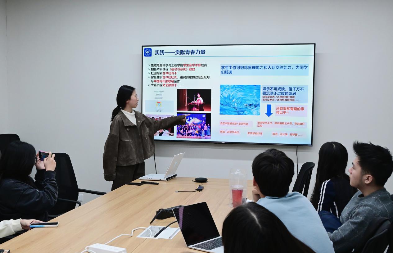 在互动环节,同学们都积极踊跃提问取经,段欣睿同学都一一耐心为其解答。其中有一个同学询问会议分享经验。段欣睿指出在汇报时,多用图表代替冗长文字,突出关键信息;应对场上随机提问,可以提前准备一份自己想到的问题清单,场上灵活应对。